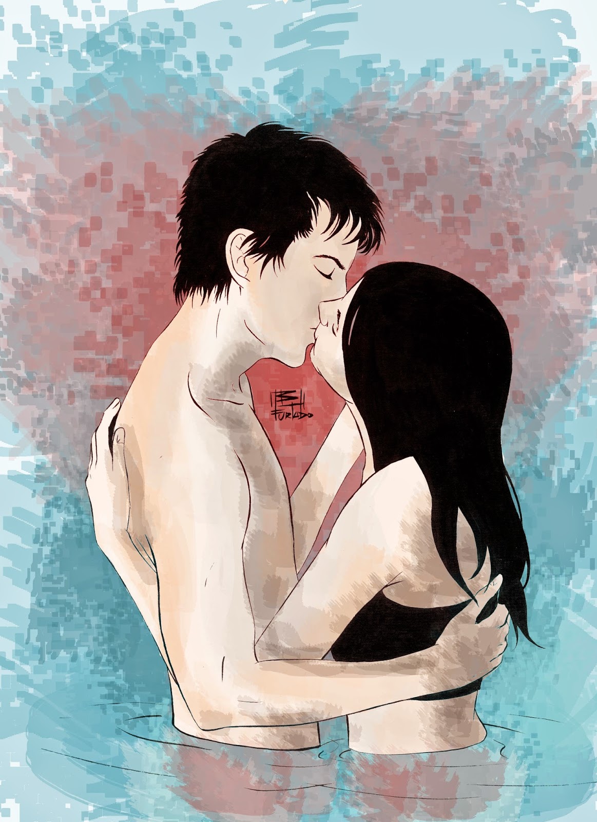 Este casal lindo a esquerda, encontrei ainda tantas vezes depois deste desenho e curto tanto, me foi inspiração para um dos dias dos namorados que passou. Estava experimentando efeitos no Photoshop e o resultado me deixou muito feliz! Utilizei pela primeira vez pincéis diferentes no programa, os “Natural Brushes”, que deram este efeito no plano de fundo. Além disso, variação de fluxo no pincel e opacidade fizeram bastante diferença e foram um precioso aprendizado!