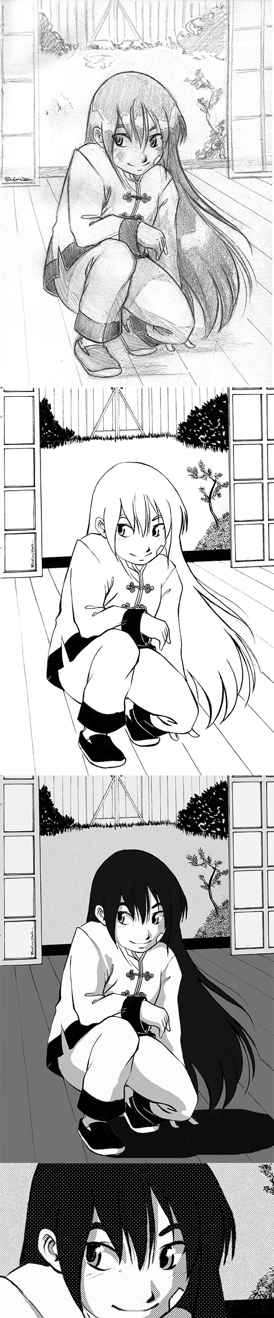 Coloquei abaixo a arte final (utilizei pincel e nankin), e parte do processo de acabamento até a finalização da obra: