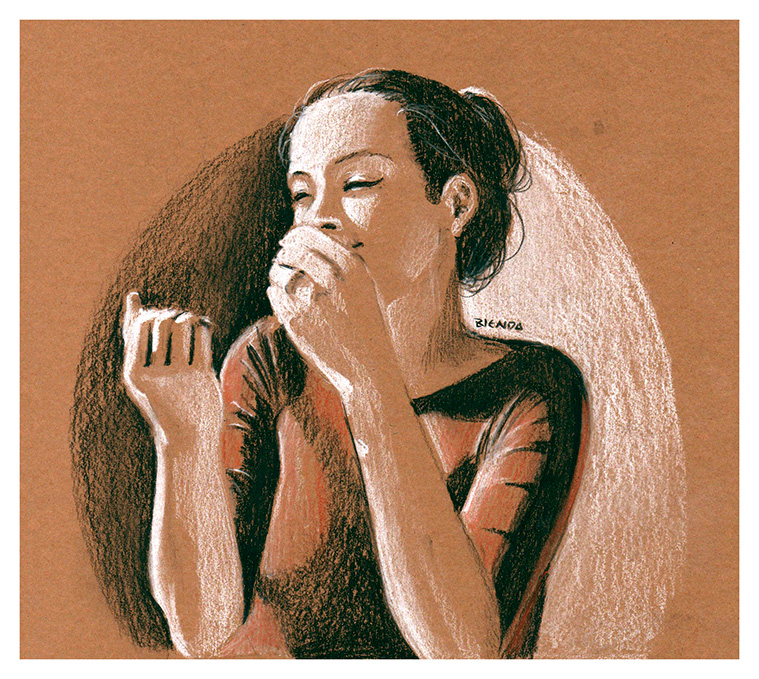 Este foi um estudo de luz e sombra em papel colorido. Utilizei carvão para os pretos e pastel seco para os brancos e avermelhados.