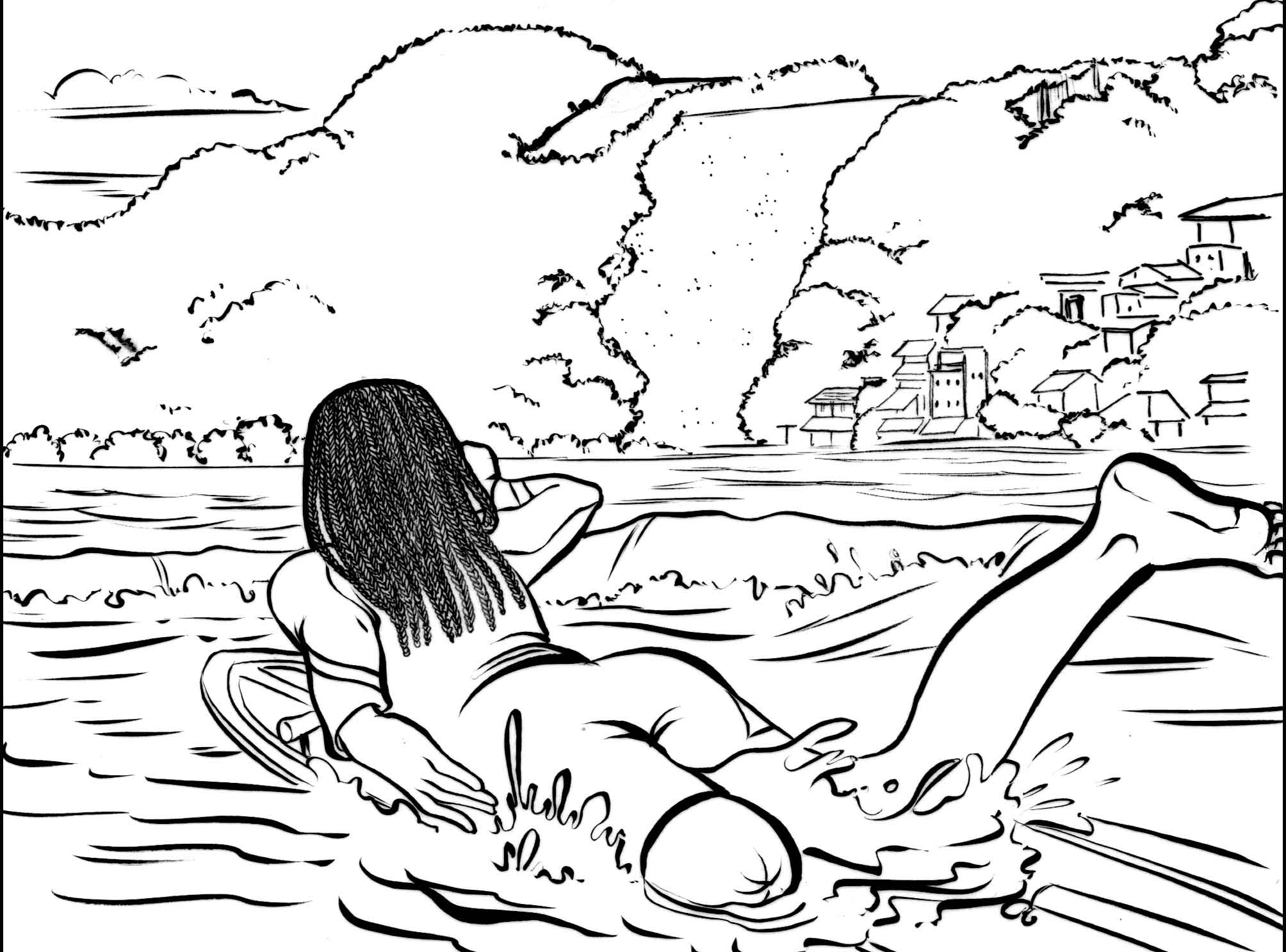 Você conhece Irene? Ela é uma garota negra, que sai da cidade de Tibau para a capital do Estado, fugindo de um passado triste e assustador e foi acolhida por Dona Nenzinha, que a faz trabalhar em sua lanchonete. Surfista com receio de pegar onda novamente, aos poucos Irene vai sendo obrigada a encarar seus traumas e essa experiência vai mudar completamente sua vida. Este é um dos projetos que venho trabalhando junto a uma equipe de mulheres maravilhosas! Estou arte finalizando as páginas deste quadrinho de roteiro de Milena Azevedo, arte de Sueli Mendes e Chairim Arraes, com cores de Weyne Ribeiro.